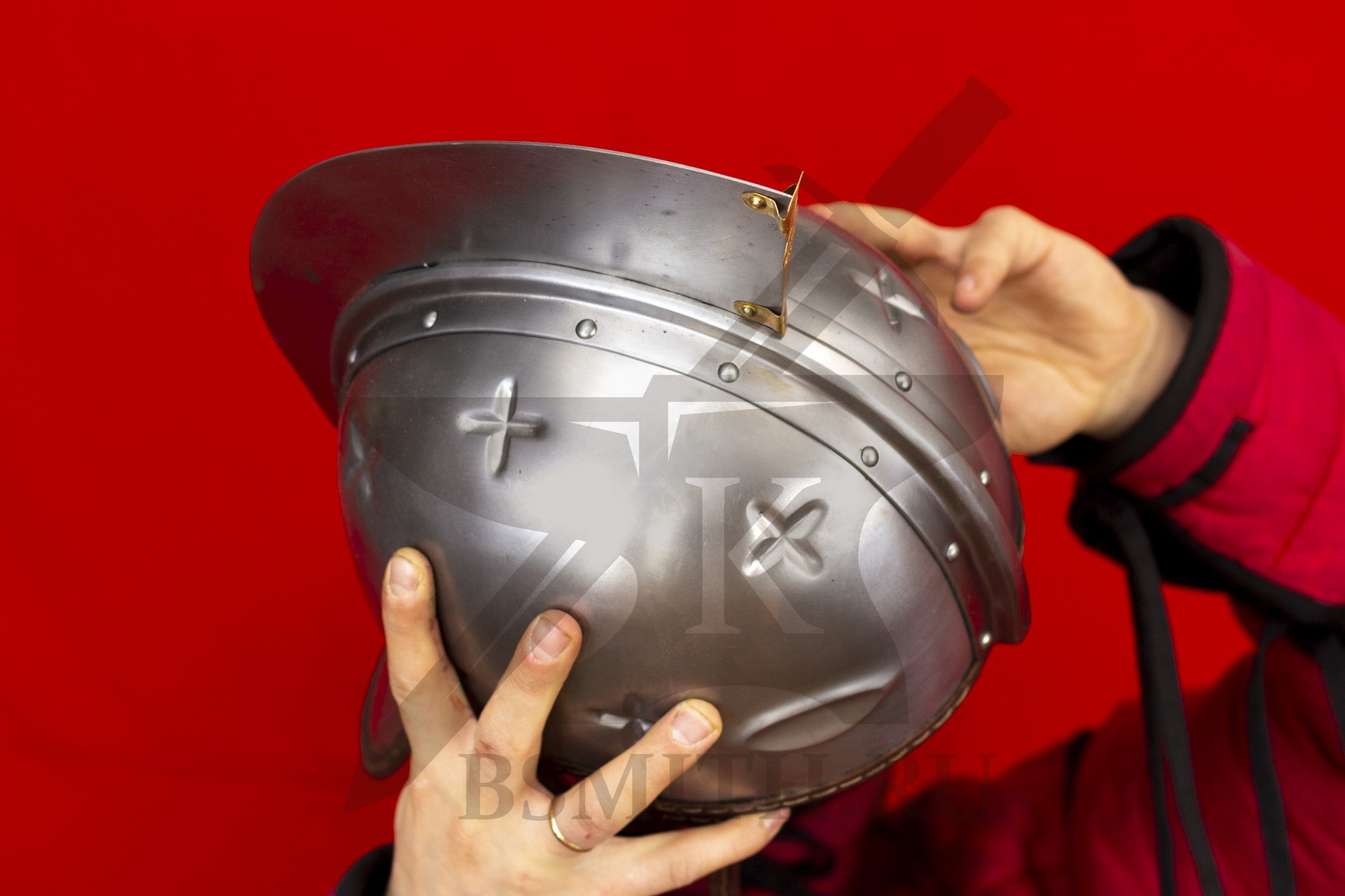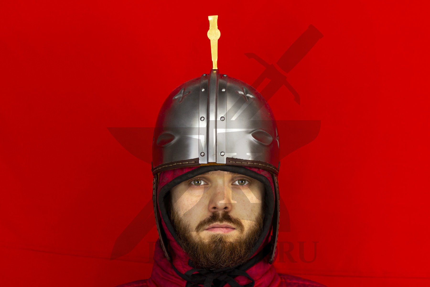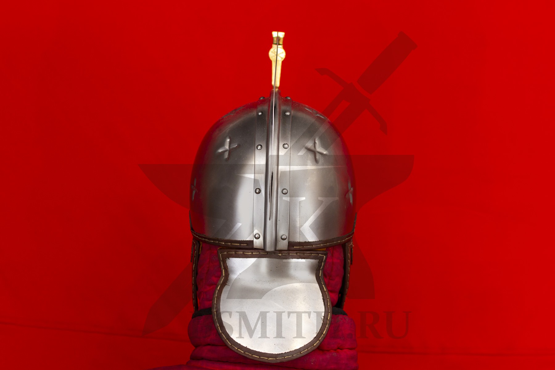 Купол сталь СТ3, 2 мм, шлифовка. Съемный гребень с латунной инсигнией. Шлем укомплектован кожаной подвеской "парашют" и подбородочными ремнями с латунной пряжкой.