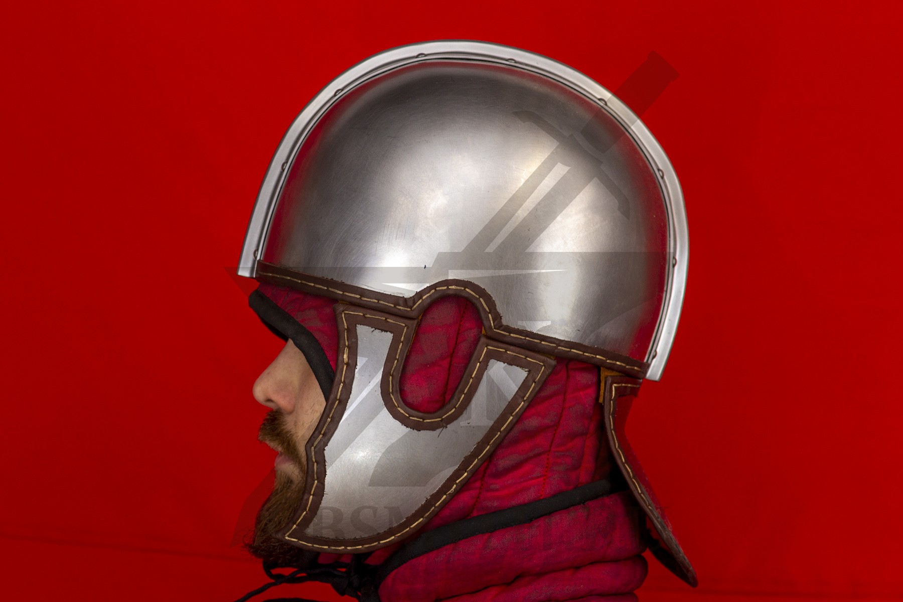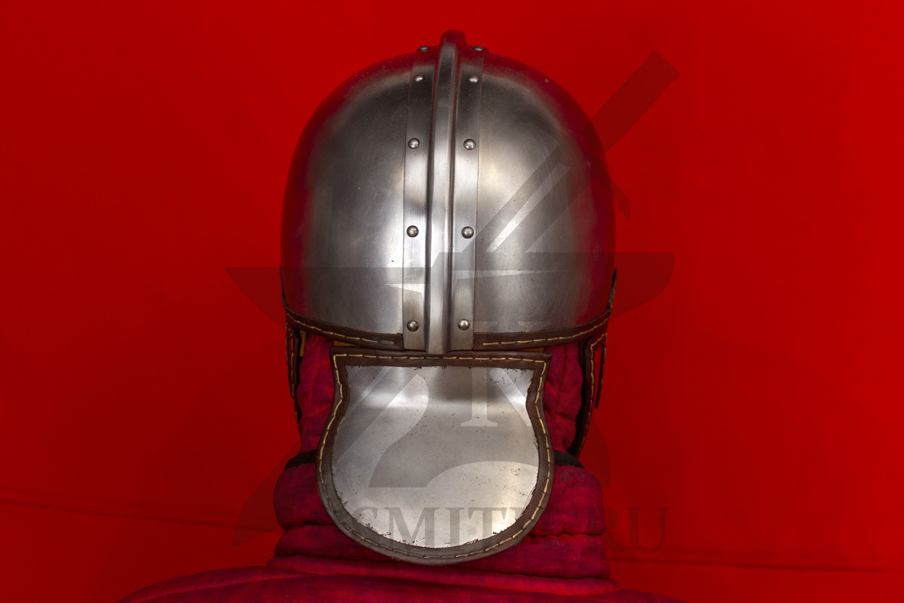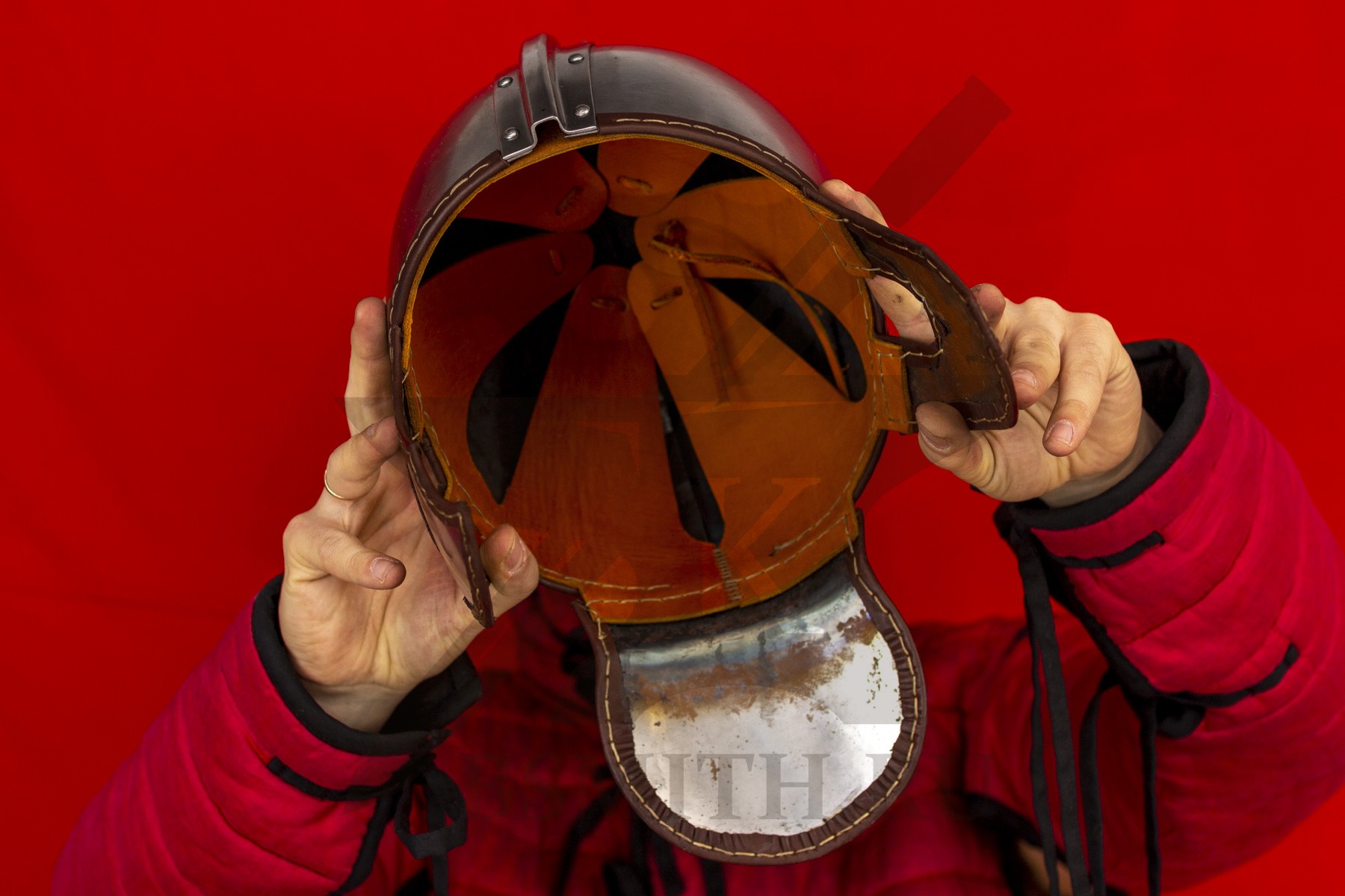 Купол сталь СТ3, 2 мм, шлифовка. Двухчастный купол, пришитые нащечники и назатыльник с кожаным кантом.