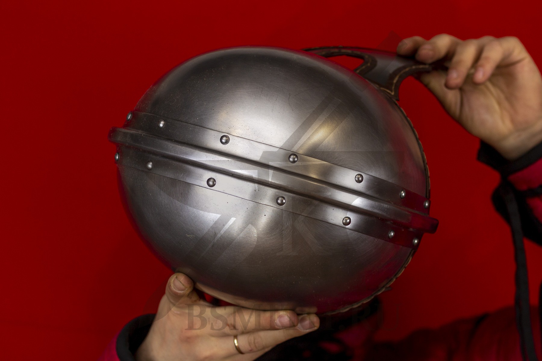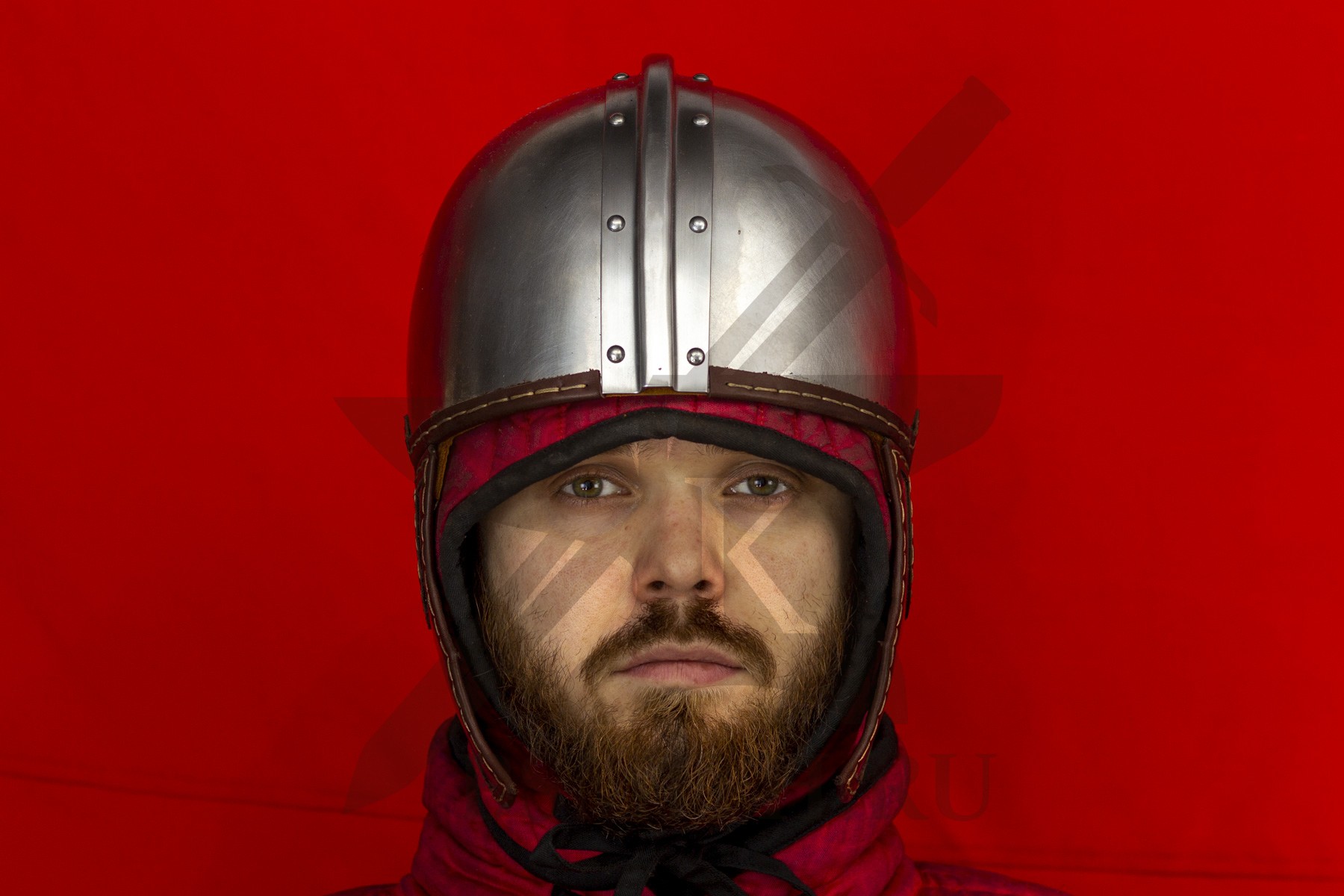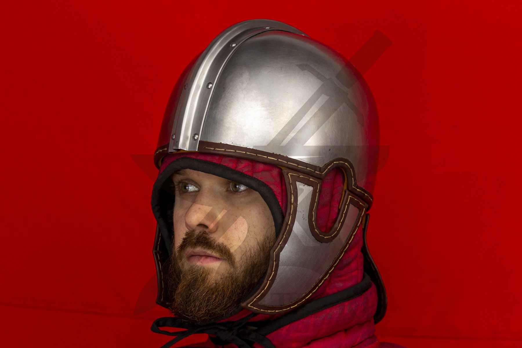 Купол сталь СТ3, 2 мм, шлифовка. Двухчастный купол, пришитые нащечники и назатыльник с кожаным кантом.